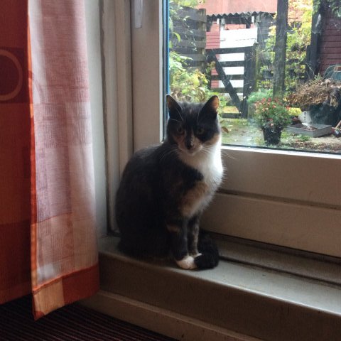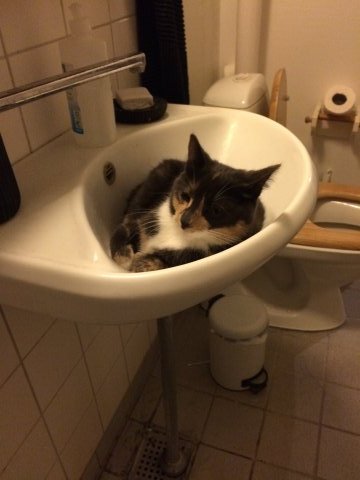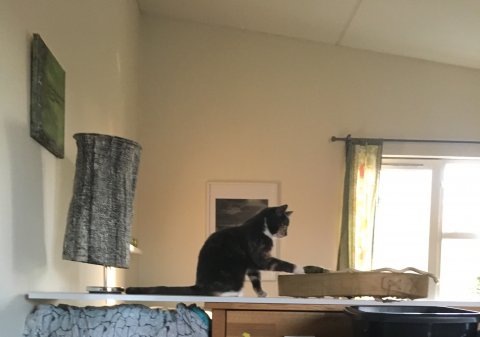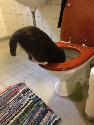 Den har aldrig lært at fange fugle og mus, men hun er ret god til at fange skruelåg fra plastikflasker og lign. Når jeg gør rent, kan jeg finde de "forsvundne" ting under møblerne.